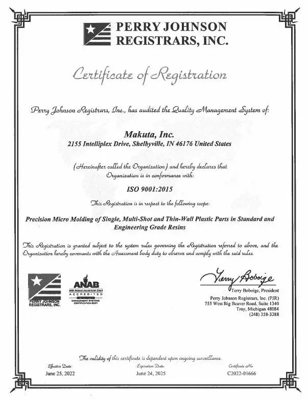 Founded in 1996, Makuta Micro Molding is 100% U.S. owned and operated. We’re located 20 minutes east of Indianapolis, Indiana, in the town of Shelbyville. Our plastic injection micro molding facility, which was specially built in 2007 to house our lights-out micro molding operations, operates 24 hours per day, 7 days per week. Consistently at the forefront in the field of micro injection molding. Makuta, Inc. is ISO 9001 and ISO 13485 certified as well as class 8 clean room certified. We are the only micro injection micro molding company in the world that is certified to manufacture products made with DuPont™ Vespel® materials.